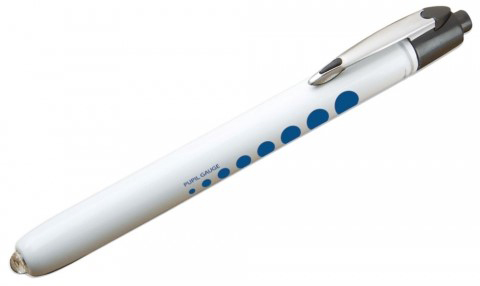 Aluminum Housing * Locking Push Toggle Activated * Measures 5-1/4 Long By 1/2 Diameter * White Barrel With Pupil Gauge * Two Aaa Batteries Included
