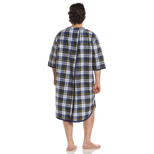 Large – X-large * 50/50 Poly/cotton * V-neck Styling With The Comfortable Look Of Shirttails * Wraparound Design Short Sleeves * One Gown Per Package * Blue Plaid *